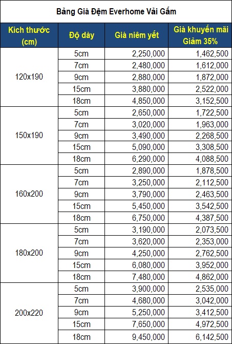 Độ dày tiêu chuẩn: 5cm, 7cm, 9cm, 15cm và 18cm