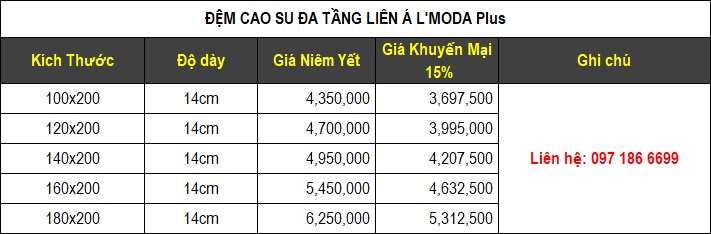 Nệm đa tầng L’MODA có những đặc tính ưu việt so với các sản phẩm nệm cùng loại trên thị trường. Giải pháp đem lại cảm giác êm ái và thoải mái như đang sử dụng nệm cao su thuần khiết với một mức giá hoàn toàn hợp lý. L’Moda kết hợp 2 loại chất liệu bao gồm lớp cao su 100% thiên nhiên dày 2.5 cm và các lớp PU-HR, giúp nâng đỡ cơ thể vững chãi.