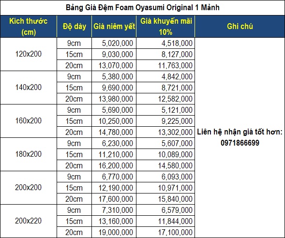 Nệm Oyasumi Original tiêu chuẩn 1 tấm là mẫu nệm foam cao cấp sử dụng chất liệu Pu foam an toàn tuyệt đối, ôm sát đường cong cơ thể mang đến cho người dùng giấc ngủ êm ái, sảng khoái. Sản phẩm có độ dày đa dạng tiện lợi cho người tiêu dùng lựa chọn: 9cm, 15cm, 20cm.