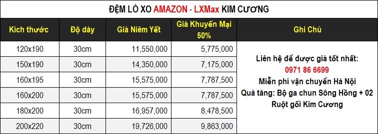 Đệm lò xo Amazon - LXMax Kim Cương là sự kết hợp đặc biệt giữa cấu trúc lò xo túi và lớp tiện nghi đa lớp: mousse memory, bông ép Polyester, vải không dệt… giúp hỗ trợ và nâng đỡ cột sống tối ưu.