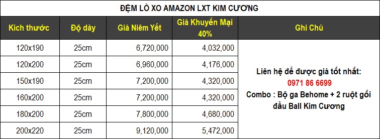 Đệm lò xo Amazon - LXT ( đệm lò xo túi ) là dòng đệm lò xo túi độc lập cao cấp của công ty nệm Kim Cương. Trải qua nhiều năm nghiên cứu sở thích người tiêu dùng, công ty nệm Kim Cương đã cho ra đời dòng lò xo túi độc lập cao cấp Amazon - LXT. Đệm lò xo Amazon - LXV tuy mới ra mắt thị trường năm 2018 nhưng được sự ủng hộ tích cực của khách hàng và Công ty TNHH Desan Việt Nam có website: dem24h.vn chính thức độc quyền phân phối và bán lẻ dòng sản phẩm đệm lò xo Amazon - LXT