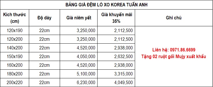 Đệm lò xo Korea Tuấn Anh: Ưu đãi 35% + 1 đôi ruột gối Mujy xuất khẩu