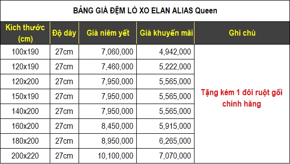 – Đệm lò xo túi Alias Queen là dòng sản phẩm cao cấp của Elan đã được khẳng định trên thị trường Việt Nam 20 năm. Đệm lò xo túi Alias được áp dụng các công nghệ tiên tiến của nước ngoài để có thể tạo ra một hệ thống lò xúi độc lập có sự dẻo dai và độ bên cao theo thời gian. Kết hợp của hệ thống lò xo túi chắc chắn và những lớp Support Foam dày dặn xung quanh hệ thống lò xo túi giúp cho nâng đỡ cột sống, tạo ra sự thoải mải tới mọi tư thế nằm, đưa giấc ngủ sâu hơn, và việc trở mình không hề ảnh hưởng tới người bên canh. Ngoài hệ thống lò xo túi độc đáo, đệm Alias còn có 1 lớp Pillow-Top riêng biệt trên cùng vô cùng đặc biệt. Pillow- Top được chần bởi những lớp Contour Foam + Soft Foam dày 5 cm với áo vải gấm đính lượng cao tạo ra sự êm ái và giúp cho giảm streess trên từng nhóm cơ khi trải lưng nằm đặc biệt là vùng lưng và hông.