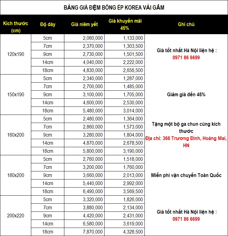 Đệm bông ép Hanvico : Ưu đãi 25% + 1 bộ ga chun cotton