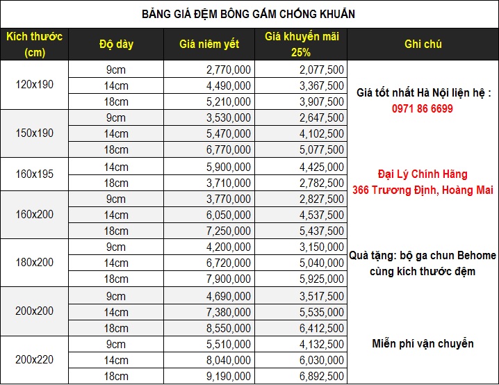 – Độ dày tiêu chuẩn: 5cm, 7cm, 9cm, 15cm và 18cm