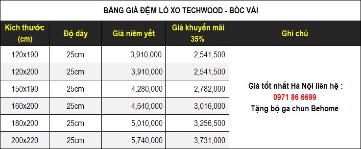 Đệm lò xo TechWood Korea: Ưu đãi 35% + ComBo quà tặng ( 1 Bộ ga gối Alina Kim Cương)