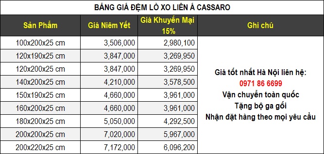 - Đệm lò xo Cassaro được cấu tạo từ hệ thống lò xo được sản xuất theo quy trình khép kín đạt tiêu chuẩn Anh Quốc có chức năng đồng bộ hóa độ cứng trên mặt đệm tạo nên sự nâng đỡ cân bằng trên các vùng tiếp xúc giữa đệm và cơ thể.