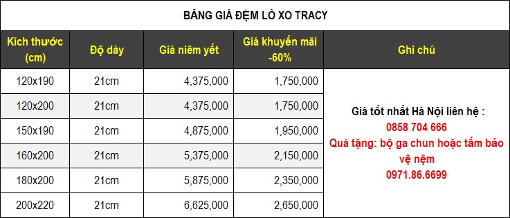 - Với những đặc điểm trên, đệm lò xo Tracy xứng đáng là sản phẩm chăm sóc giấc ngủ và bảo vệ sức khỏe người nằm có độ bền cao, dễ dàng sử dụng và vệ sinh, giá thành lại vô cùng tiết kiệm, phù hợp cho cả những gia đình có thu nhập trung bình.